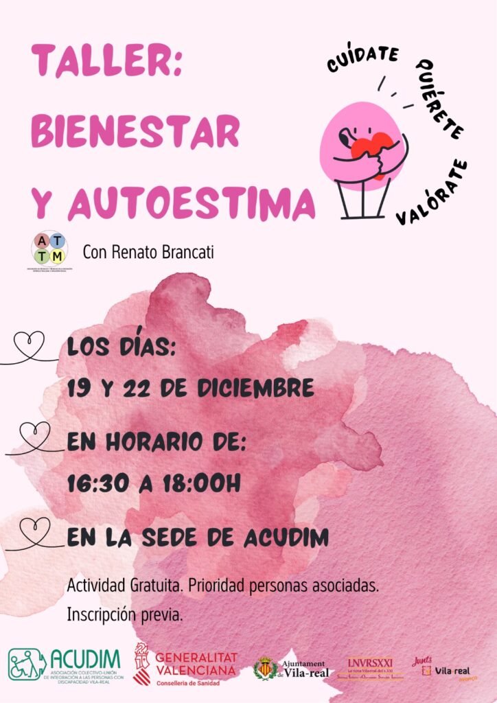 Taller Benestar i autoestima, de la mà de Renato Brancati. Els dies 19 i 22 de desembre. En horari de 16.30 a 18.00 h, a la seu d’ACUDIM.❤️‍🩹🌸🌈
