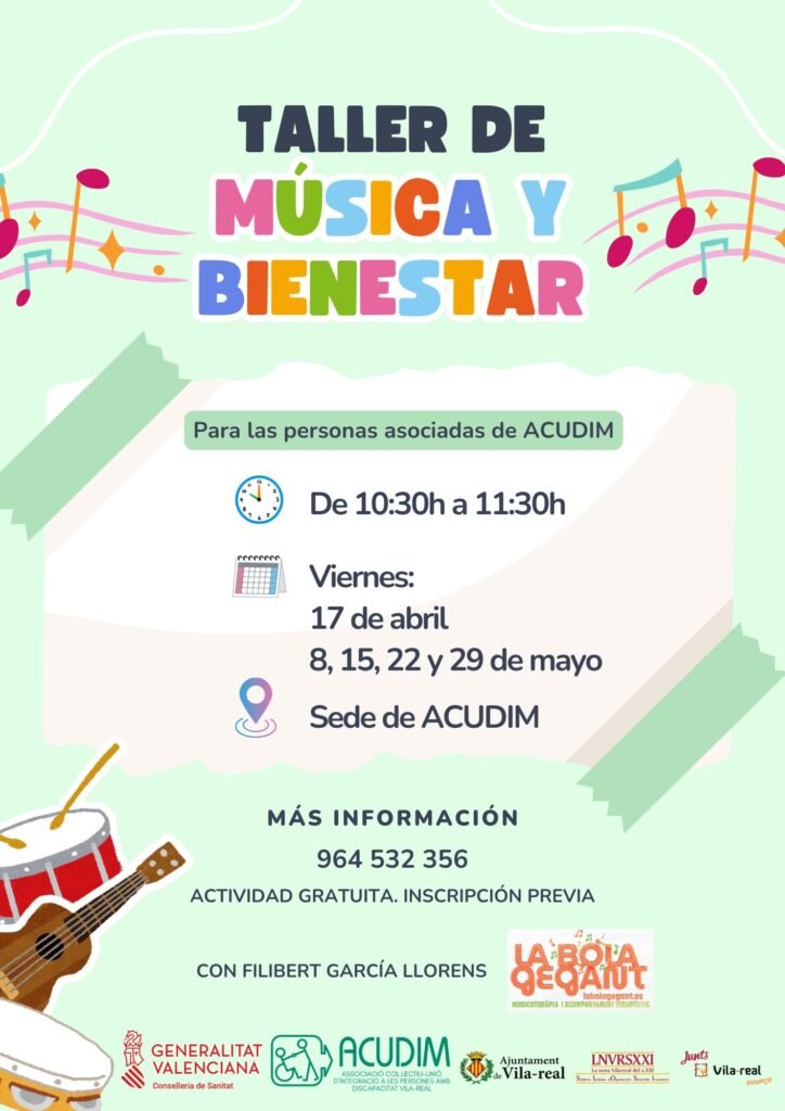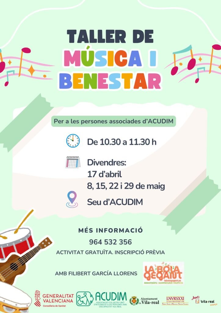 N O U TALLER: MÚSICA I BENESTAR. 🎼🥁🪈🪇 Els dies 17 d’abril, 8, 15, 22 i 29 de maig (divendres). En horari de 10.30 a 11.30 h, a la seu d’ACUDIM. Estàs preparat o preparada per a deixar-te portar per la música? 🥰🍃 Un viatge vivencial i especial que no et pots perdre! 😉 Més informació en el tel. 964 532 356. PER A PERSONES ASSOCIADES – Inscripció prèvia